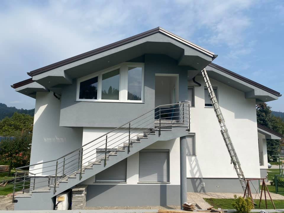 Nova fasada na hiši, popravilo fasade, odstranitev zaključnega sloja obstoječe fasade, zapiranje napušča, izdelava cokla, izolacija čela balkona, zaključni sloj fasade, fasada 10 cm, kontaktna fasada, adaptacija fasade, fasaderstvo.
